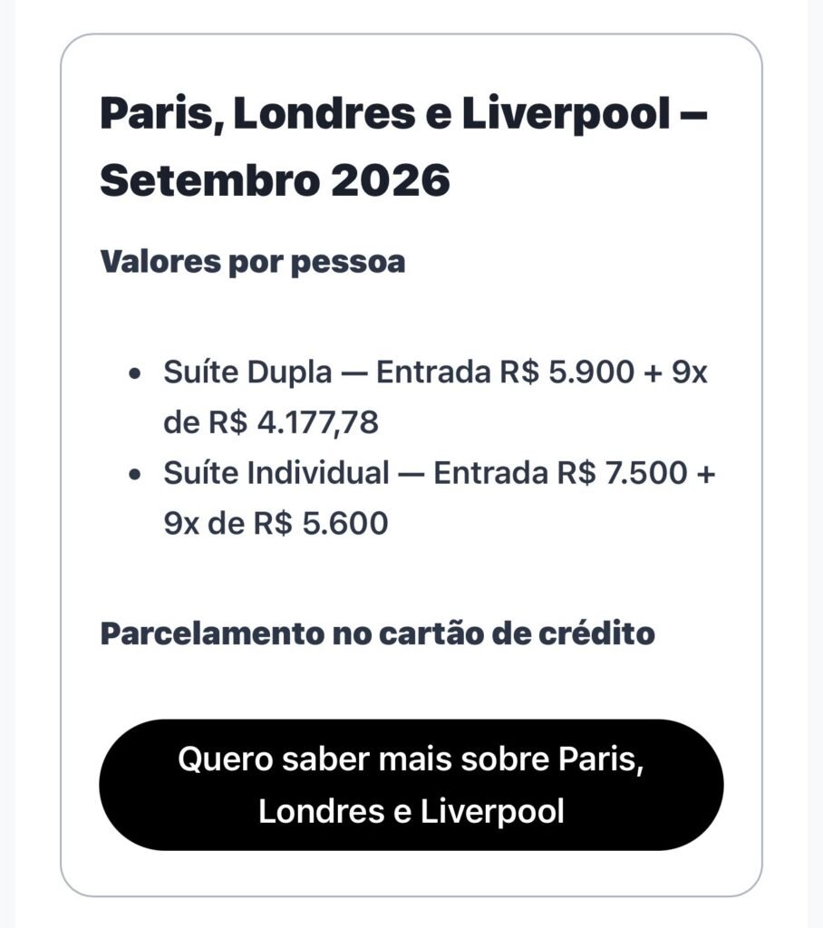 Uma viagem em grupo pensada para quem quer viver o melhor da Inglaterra e da França com conforto, segurança, acompanhamento desde o Brasil e experiências realmente inesquecíveis.